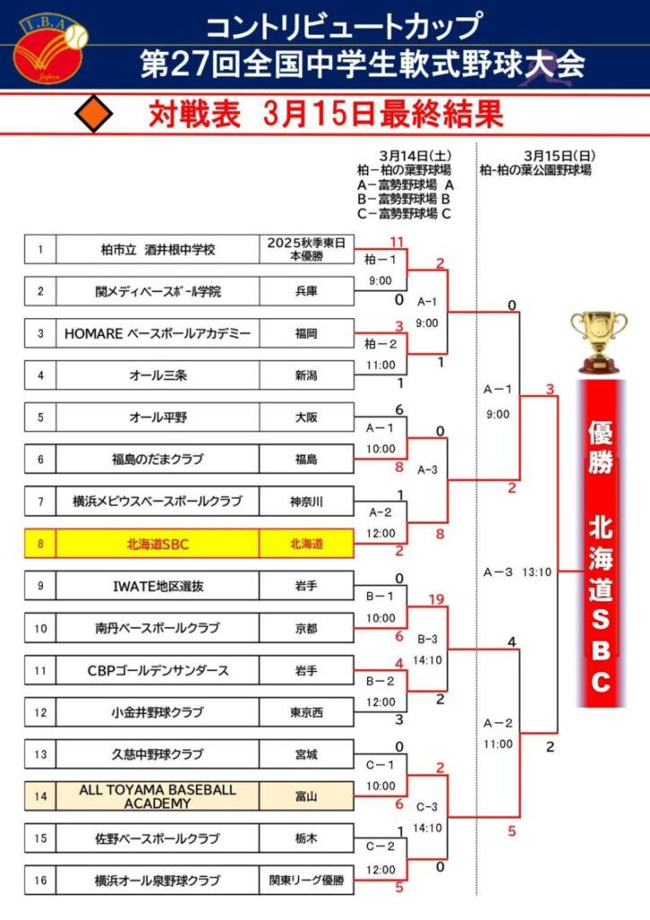2026年3月15日、2025年度U-14北海道選抜の20名が参加する大会が閉幕しました。コントリビュートカップ第27回全国中学生軟式野球大会に全国各地から16チームが集いました。大会最終日、準決勝と決勝を戦いました。